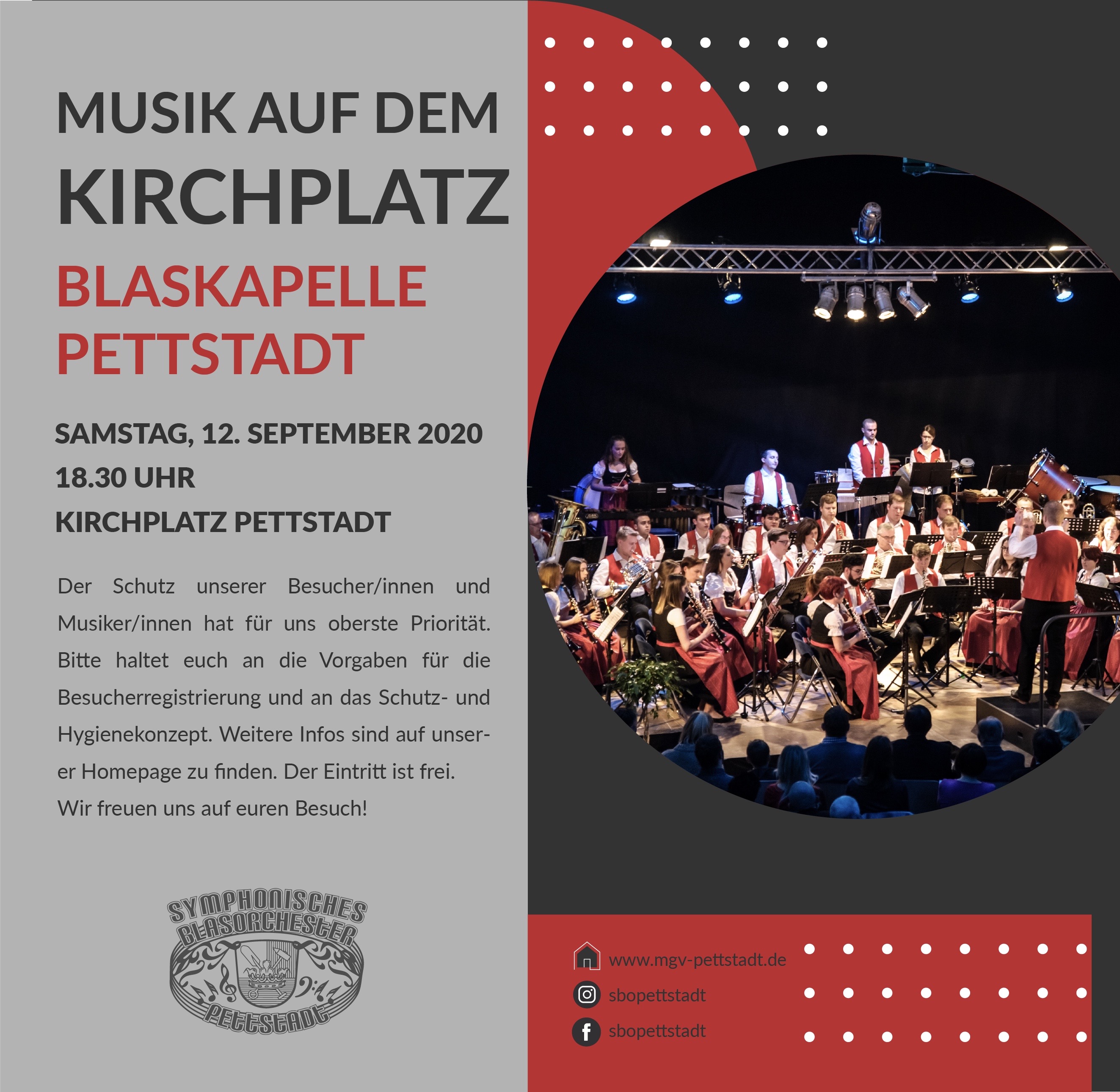 Lange durften wir für euch nicht spielen. Nach einem ungewohnt ruhigen Sommer sind wir aber nun wieder musikalisch für euch da. Auf dem Pettstadter Kirchplatz präsentieren wir euch am Samstag, 12. September 2020, ab 18.30 Uhr, was wir in den letzten Wochen geprobt haben. Mit traditioneller Blasmusik und modernen Klassikern ist für jeden etwas dabei!