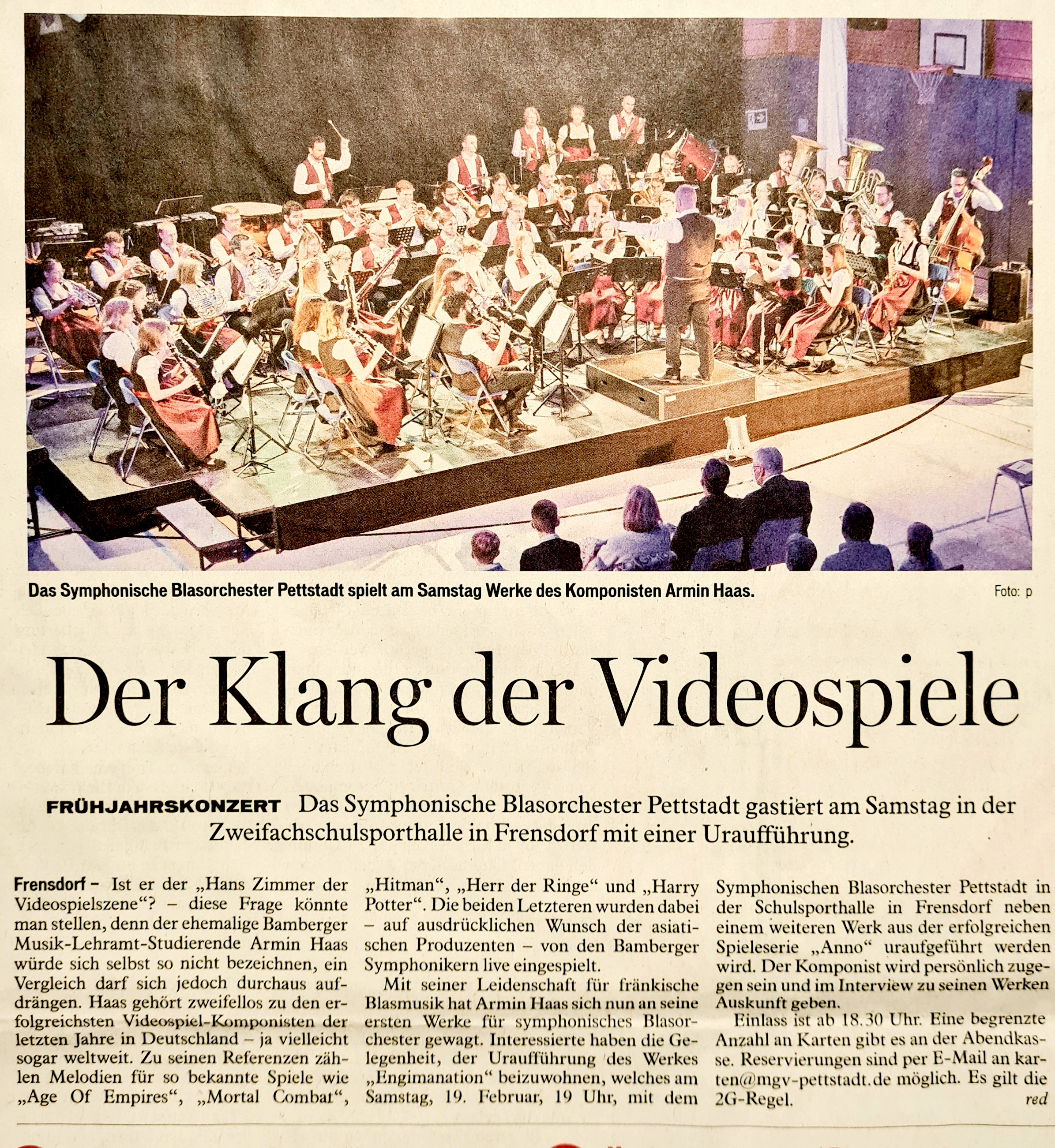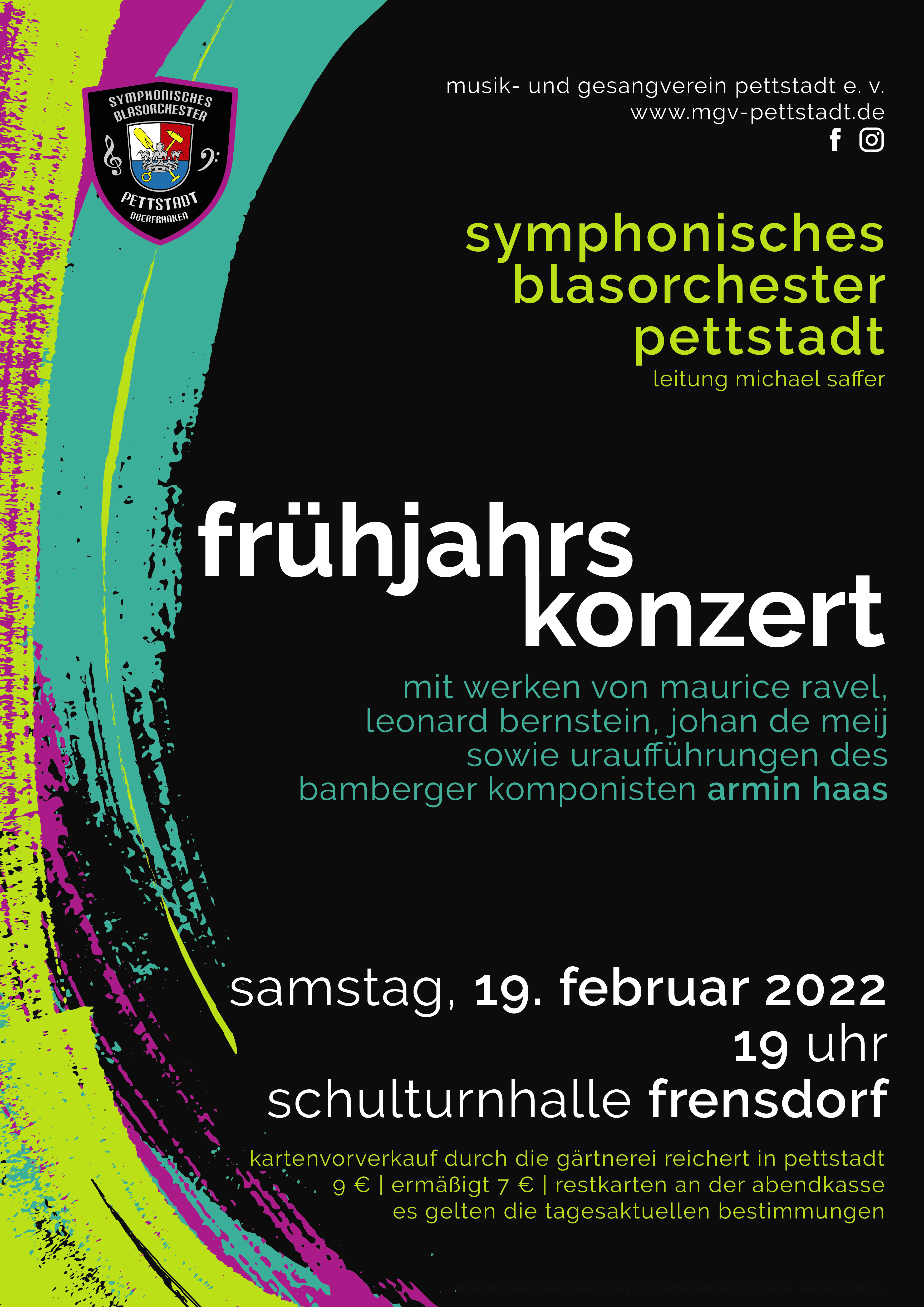 Bereits am 19.02.2022 findet das Frühjahrskonzert des Symphonisches Blasorchesters des MGV Pettstadt e. V. in der Schulturnhalle in Frensdorf statt. Konzertbeginn ist um 19 Uhr. In gewohnter Weise werden sowohl die Ohren verwöhnt als auch die anschließende Geselligkeit gepflegt, soweit dies im Rahmen der jeweils aktuell geltenden Hygienevorschriften möglich ist.