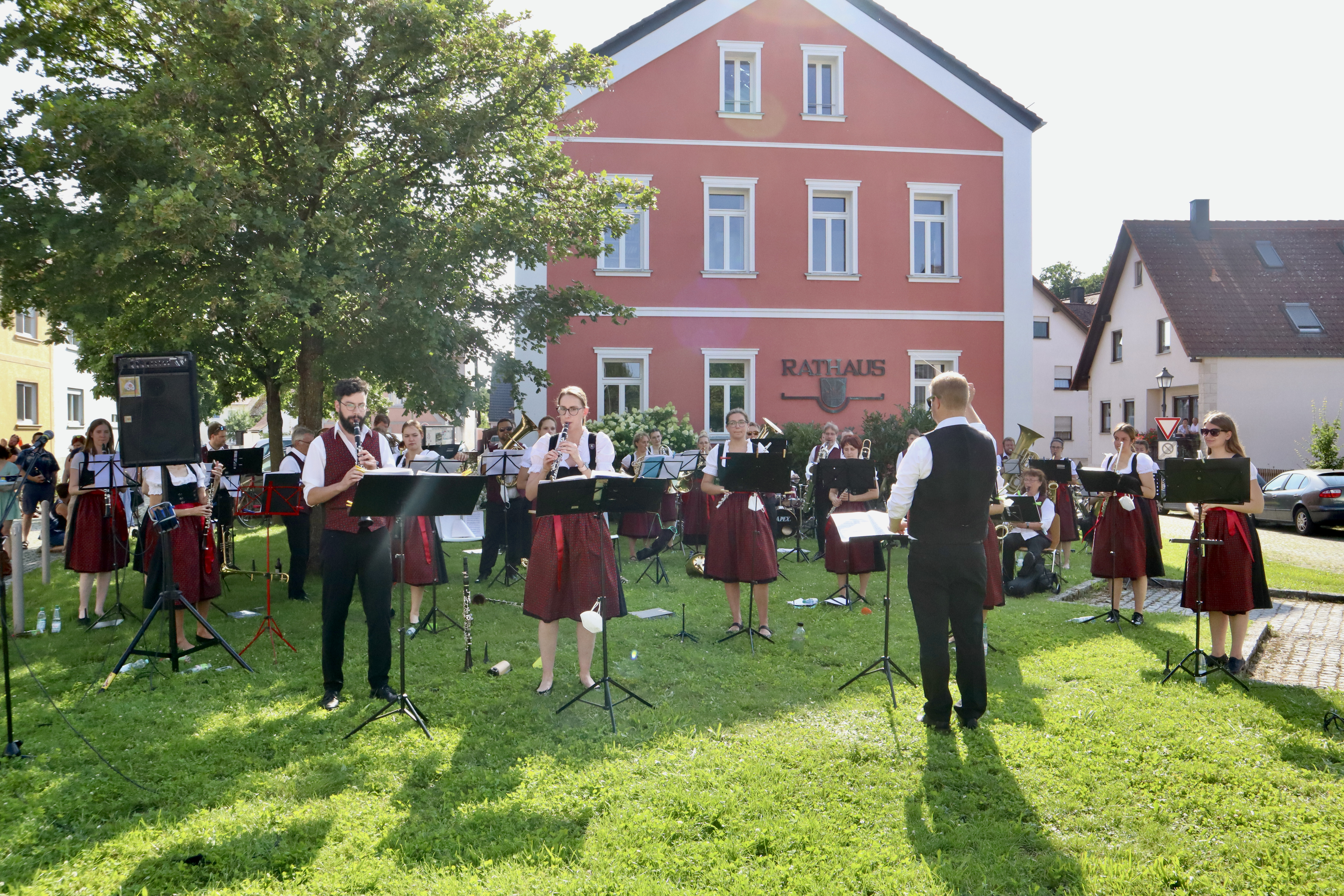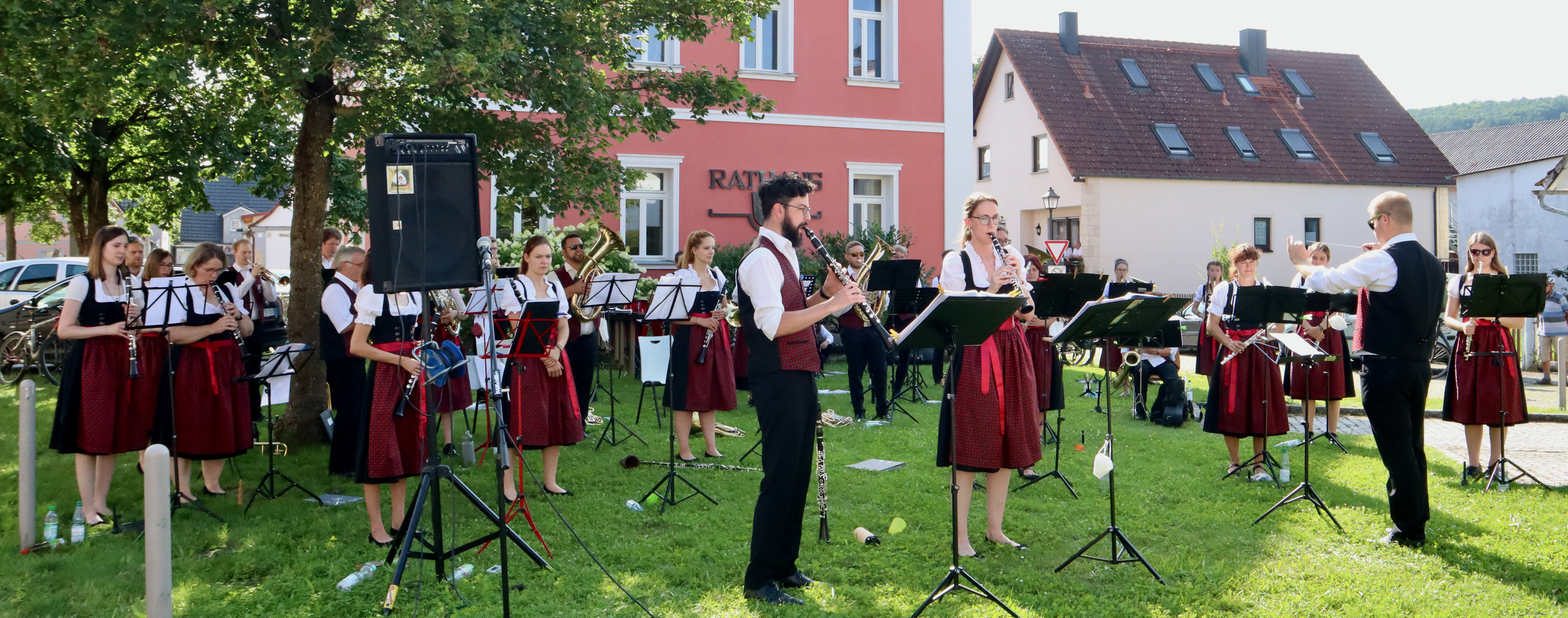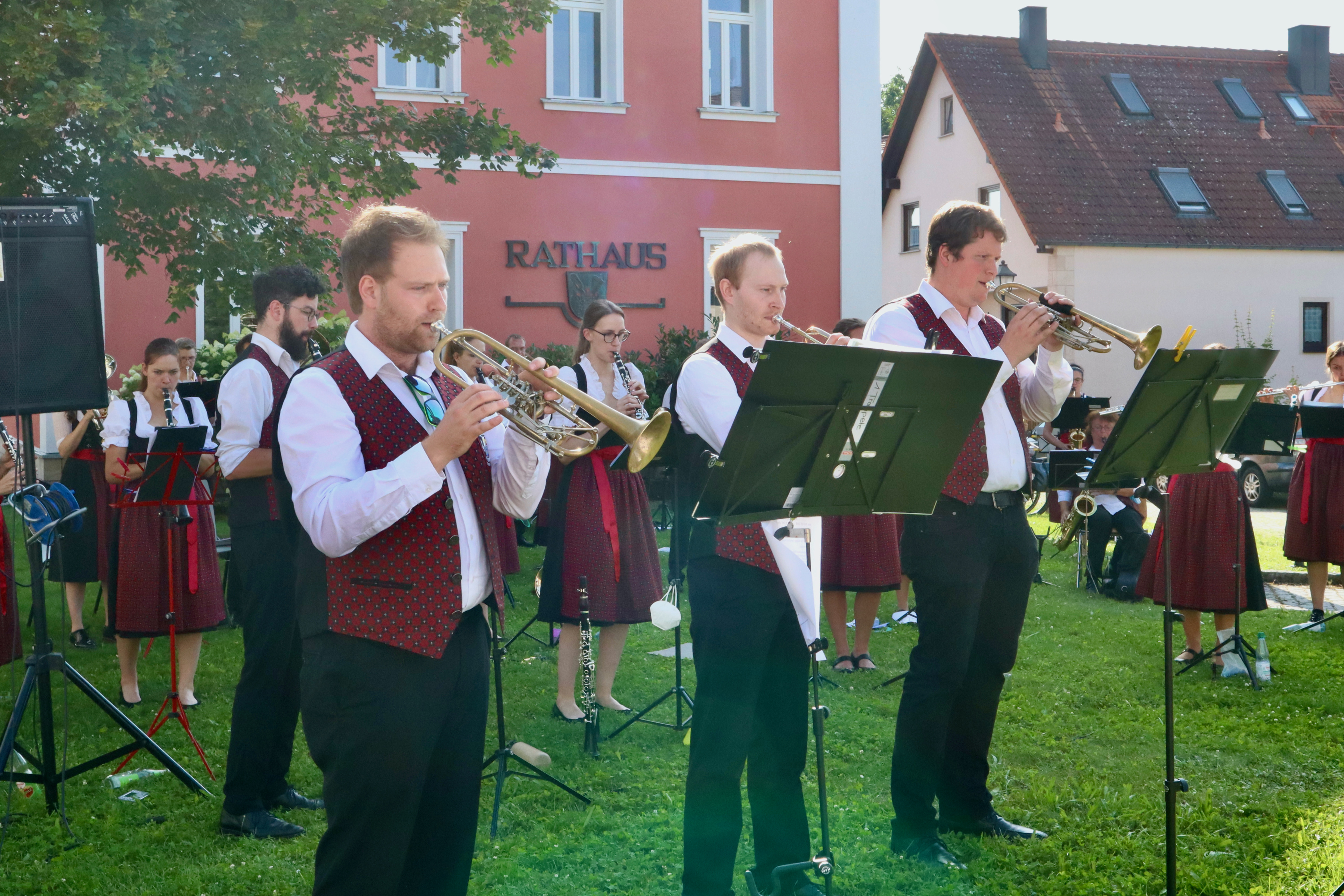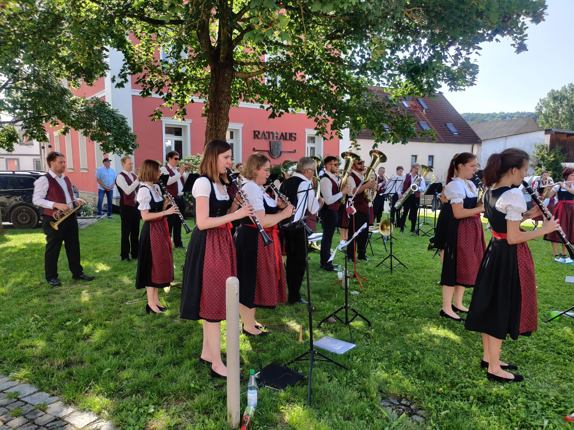 Die Musikerinnen und Musiker genossen das angenehme Gefühl, endlich einmal wieder ihrem Publikum aus wohlbekannten Gesichtern aber auch neuen Gästen ein Stück Kultur bieten zu können. Der Auftritt war nicht nur ein Schmaus für die Ohren, sondern auch für die Augen: Das Symphonische Blasorchester präsentierte zum ersten Mal die neue angeschaffte Tracht mit bestickten dunkelroten Westen und Dirndlschürzen.