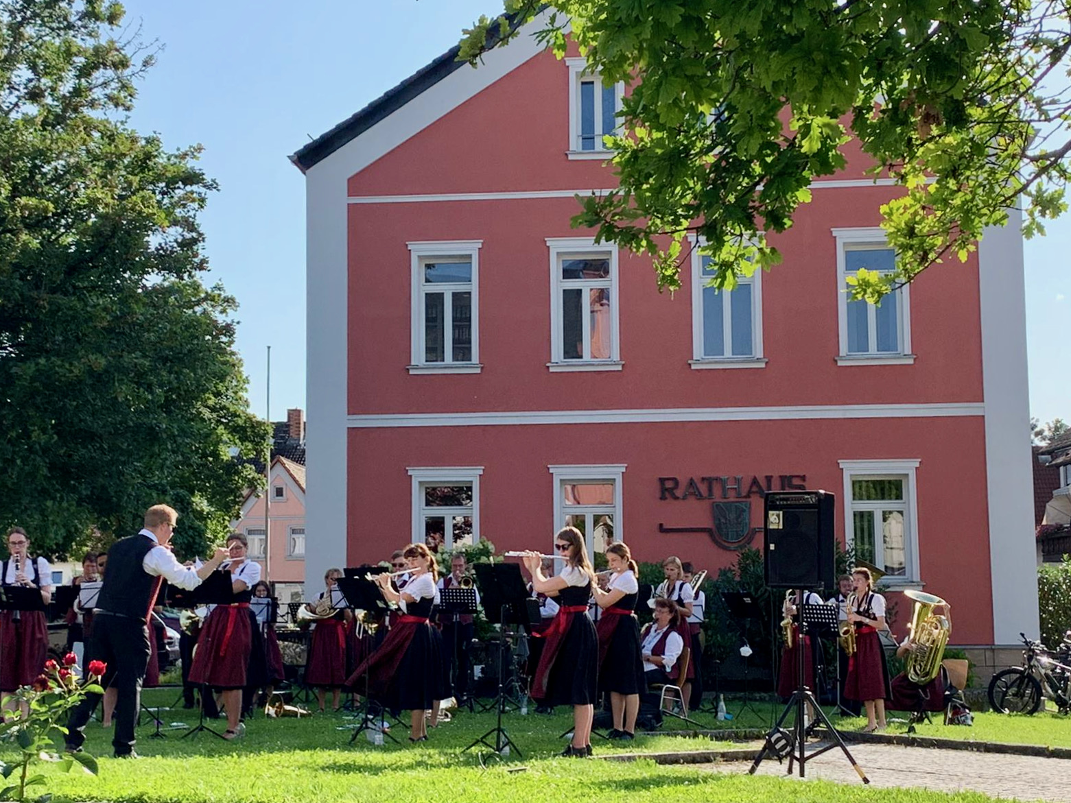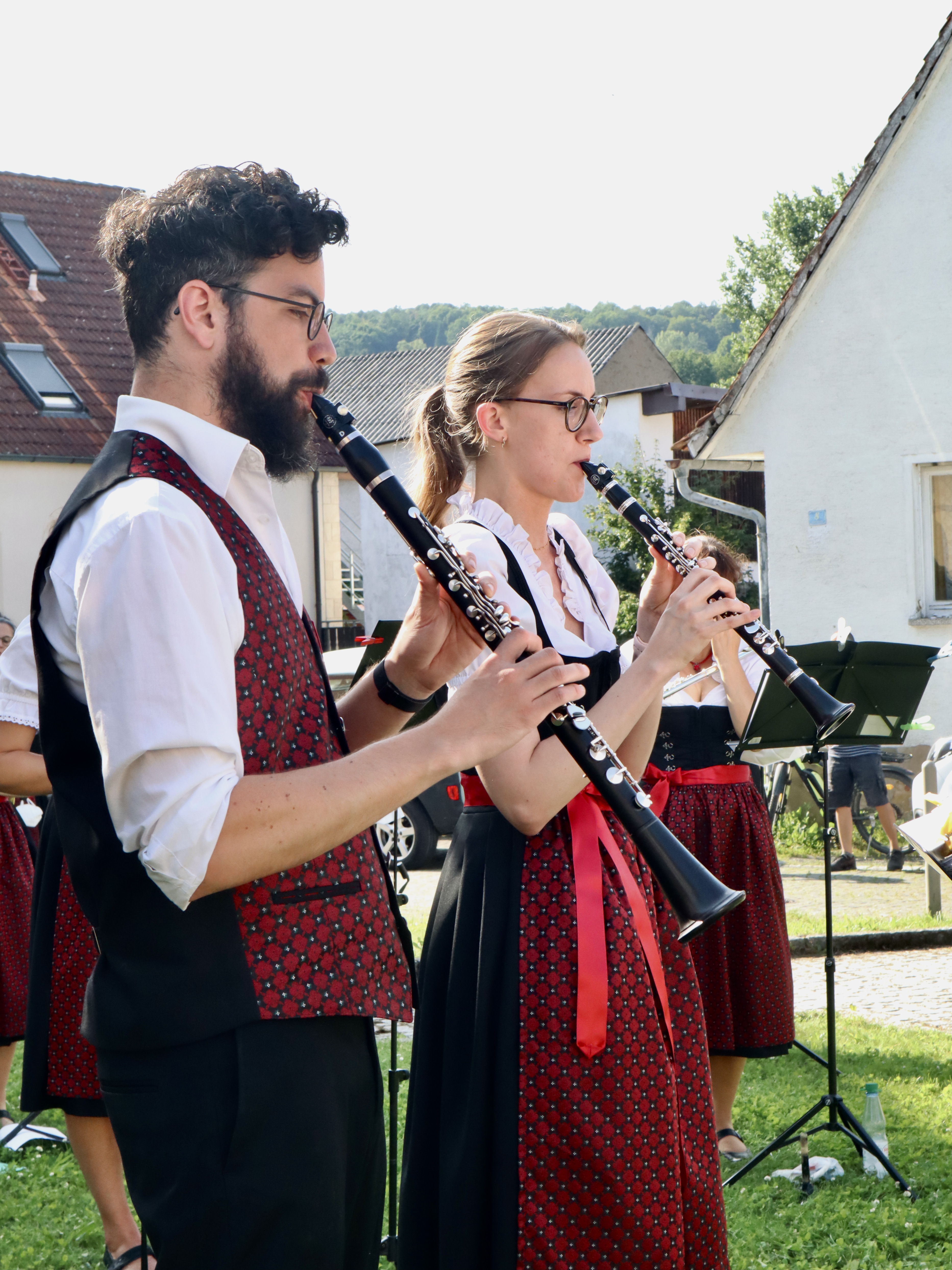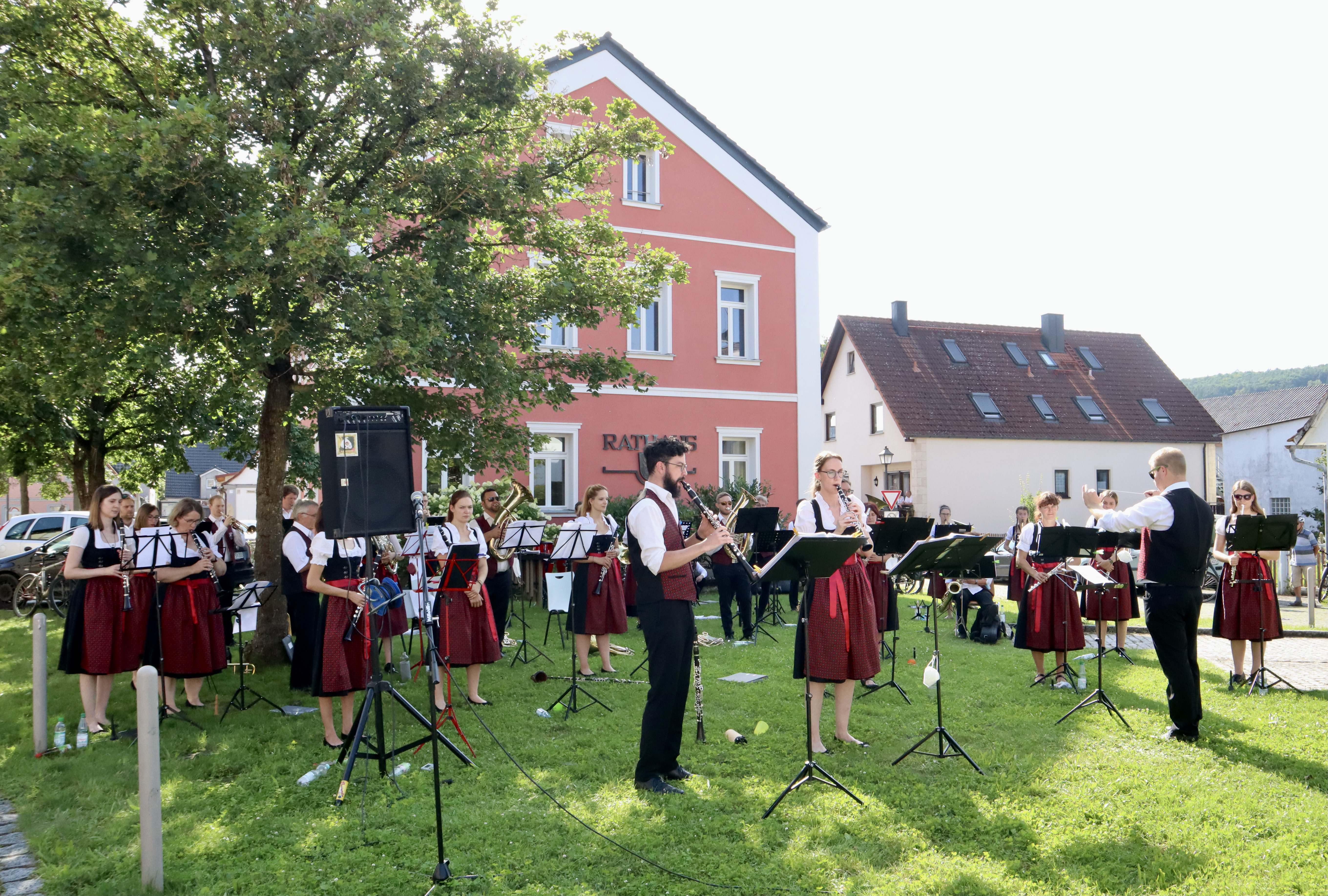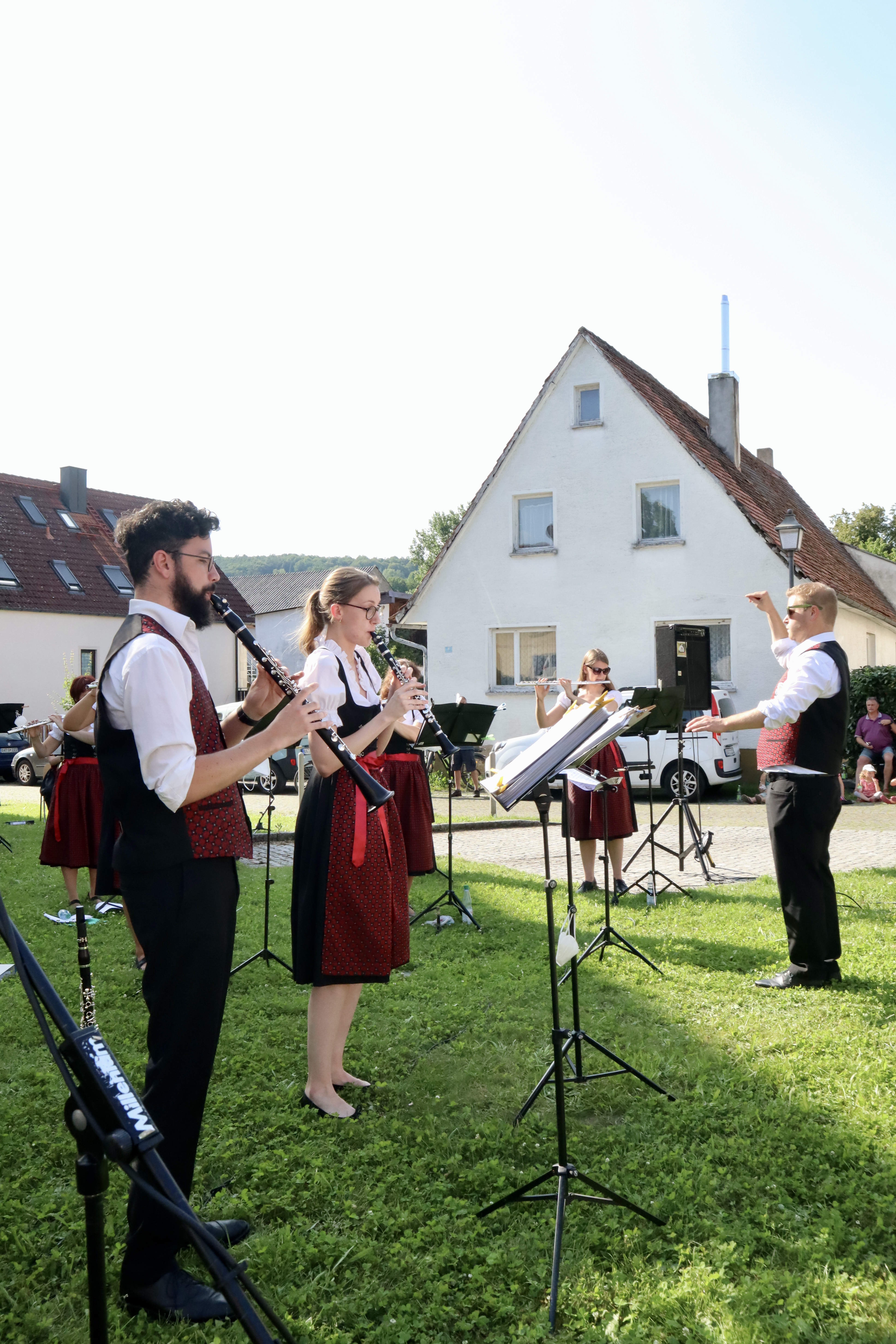 Die Musikerinnen und Musiker genossen das angenehme Gefühl, endlich einmal wieder ihrem Publikum aus wohlbekannten Gesichtern aber auch neuen Gästen ein Stück Kultur bieten zu können. Der Auftritt war nicht nur ein Schmaus für die Ohren, sondern auch für die Augen: Das Symphonische Blasorchester präsentierte zum ersten Mal die neue angeschaffte Tracht mit bestickten dunkelroten Westen und Dirndlschürzen.